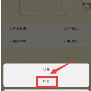 3、找到“公开”或“私密”选项旁的【公开(默认)】按钮并点击,待下方弹出窗口后,选择【私密】选项。