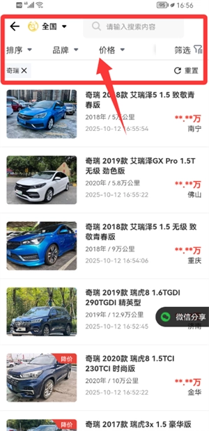 3、在搜索框中输入目标车型后,可通过排序方式、品牌分类或价格区间等条件进行筛选。