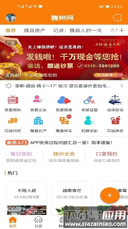 社区板块提供百姓话题、法律咨询和情感交流等内容;
