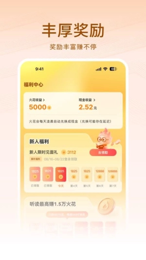 4、软件内设有福利中心,用户可在此领取火花奖励,通过听读内容还能获得额外收益。