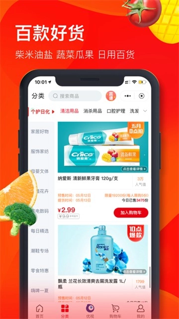 水果区、蔬菜区、肉类区、禽肉区、蛋类区、水产区、豆制品区、乳制品区、烘焙区、休闲零食区、酒水饮料区、粮油调味区、家居清洁区、美容护理区等,每日新鲜上架,供应及时,满足您家庭生活一站式购物需求。