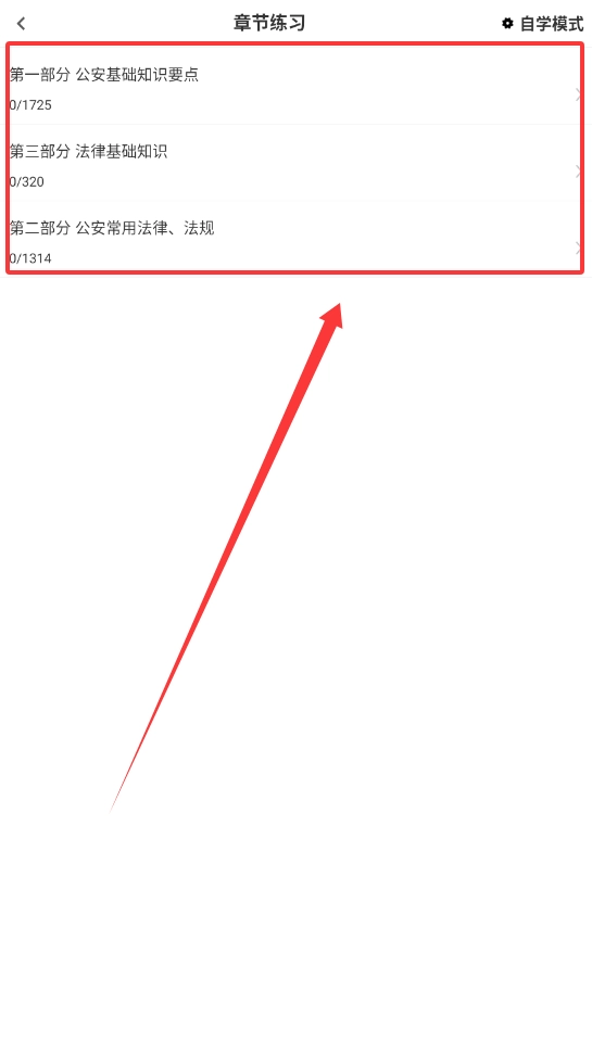1、打开软件进入首页,即可看到公安专业知识等板块,板块上会显示总题数以及你的做题进度。
