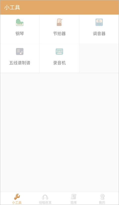 2、打开工具界面后,能看到当前的练耳大师包含五个小工具,它们分别是钢琴、节拍器、调音器、五线谱制谱和录音器。