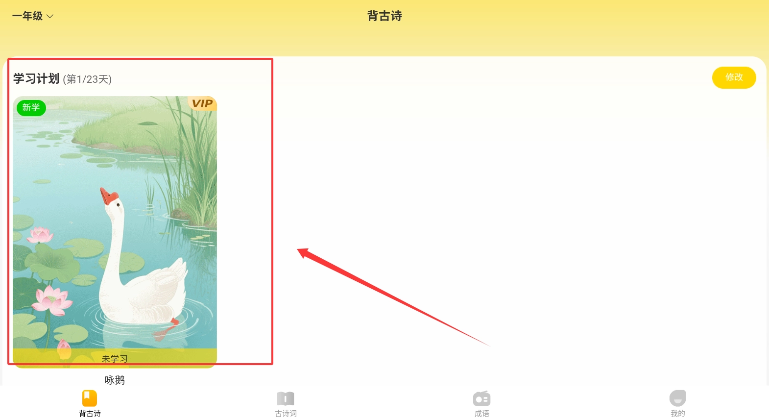 1、就能看到当前的学习计划卡片,点击带有“新学”标签和精美插画的卡片,就可以开启今日的诗词学习啦。