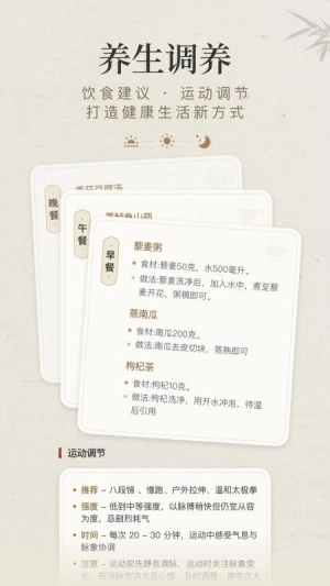 3、个性化养生方案模块可根据用户的体质特点和生活习惯,给出包括食疗建议、运动计划在内的相关内容。