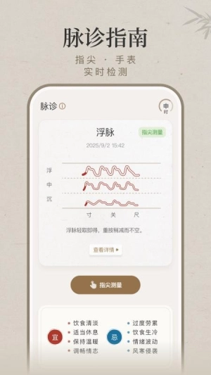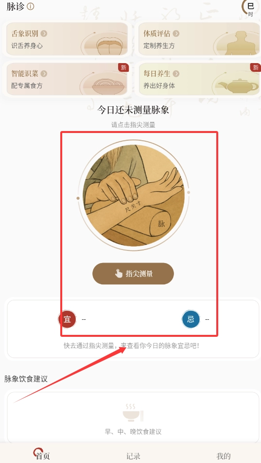 打开软件首页,舌象识别、每日养生等功能卡片一目了然,点击中间的“指尖测量”按钮,即可开启今日的脉象检查。