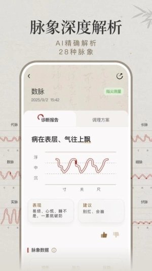 完成测量后,系统会呈现您今日的脉象结果以及对应的“宜忌”提示,另外还会给出早、中、晚的饮食建议。