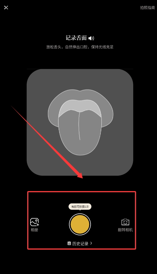 3、若需记录舌象,可进入舌象识别功能,遵循提示放松舌头、自然伸出,拍摄时注意保持光线充足。