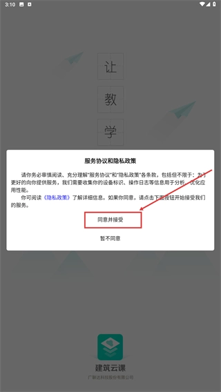 1、当应用启动时,会出现“服务协议和隐私政策”页面,你需要仔细阅读相关条款,之后点击【同意并接受】按钮,就能进入功能引导页。