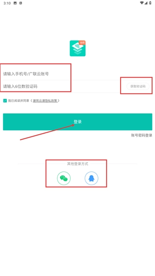 3、若选择验证码登录:在“请输入号/广联云账号”输入框中填写相关信息,点击【获取验证码】按钮,再点击【登录】按钮;此外,也可以选择微信、QQ等其他方式进行登录。