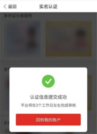 5、进入实名认证页面,依据页面提示填写并上传相关信息,点击提交后,窗口显示认证信息已成功提交。