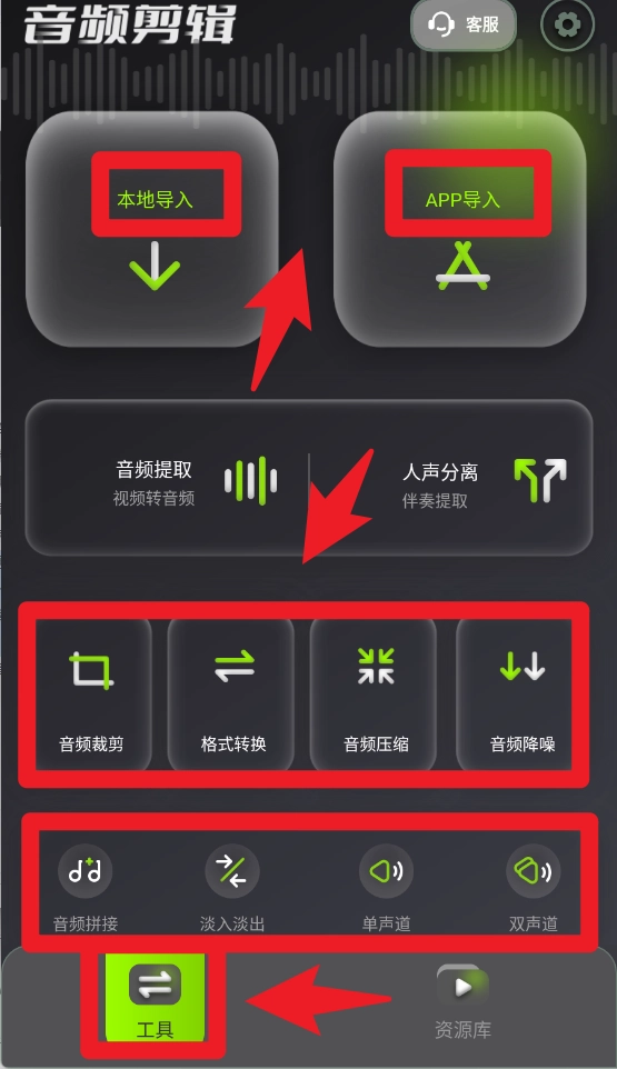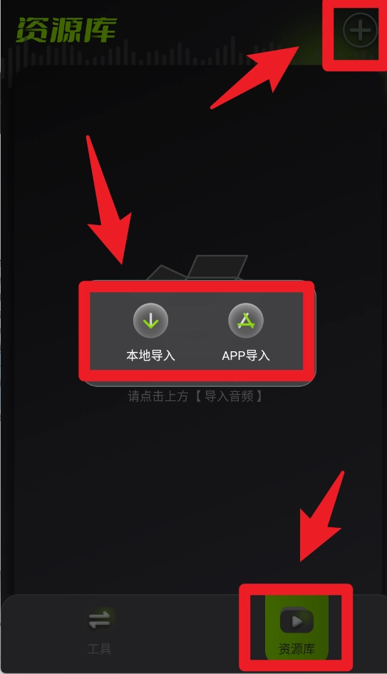 5、在资源库页面,点击右上角的+按钮,可选择本地导入或导入音频文件,便于后续进行编辑和使用。