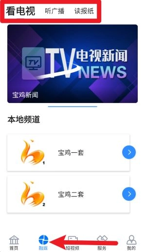 3、点击底部的融媒栏目,就能观看宝鸡新闻以及本地频道的内容,其中包含宝鸡一套和宝鸡二套的电视节目。