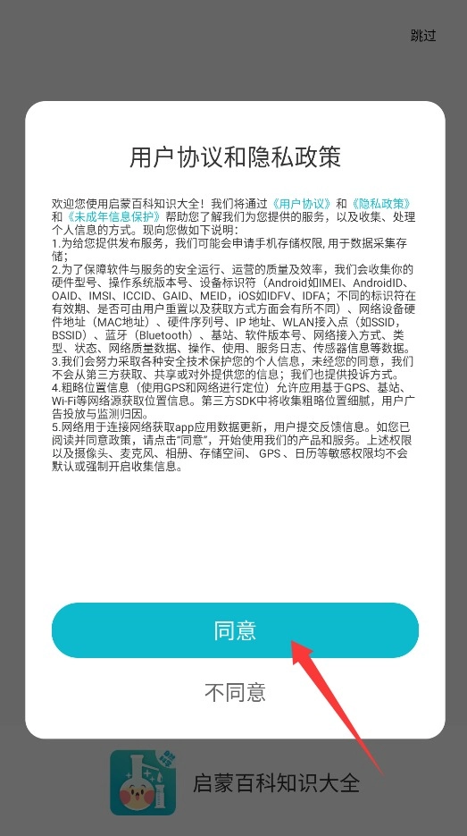 1、打开后,首次使用时需同意用户协议与隐私政策,点击“同意”即可进入主界面。