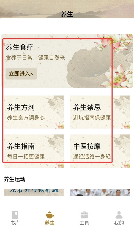 3、养生专区涵盖食疗方剂、中医按摩及禁忌指南等传统健康管理相关内容。