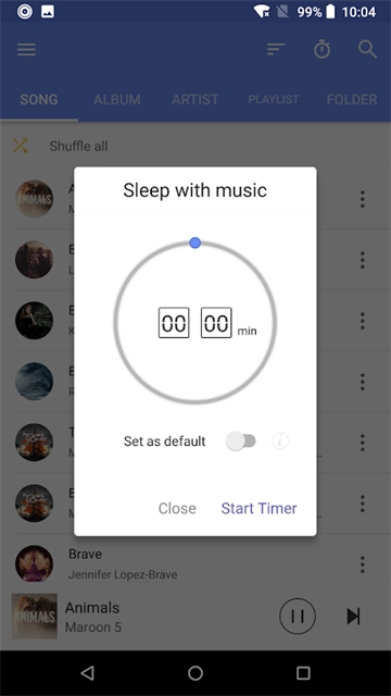 3、支持设置音乐定时关闭功能,还能将定时停止时间一键设为默认,下次播放音乐时会直接开启倒计时
