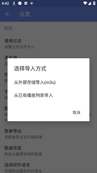 4、挑选导入的方式,无论是从外部存储导入,还是从已有的播放列表导入都是可行的。