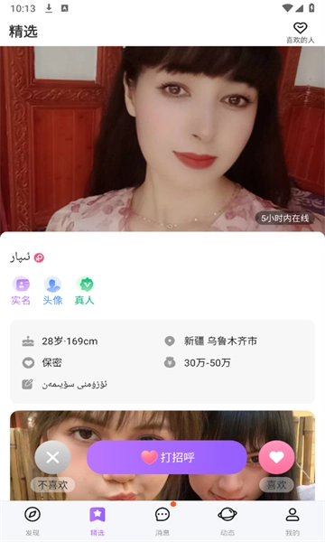 点击“精选”板块,即可查看不同用户的详细资料,若对某位用户感兴趣,可选择向其打招呼来开启交友互动。