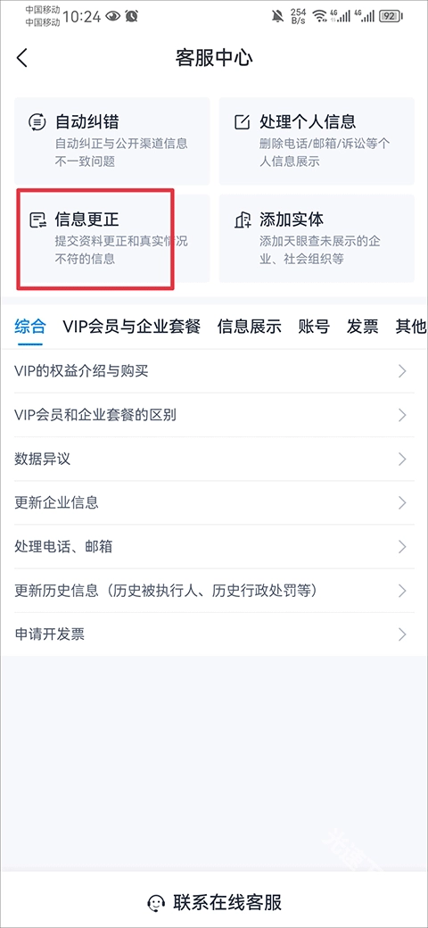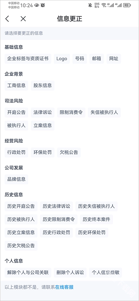 3、接着在信息更正界面里挑选你需要更正的信息,要是上述模块都不符合,可联系在线客服。
