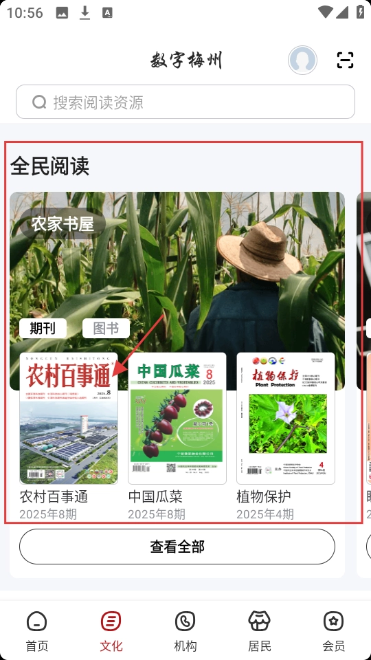 1、在文化页面中,设有【全民阅读】板块,选择《农村百事通》2025年第8期,即可进入该期刊的详情页面。