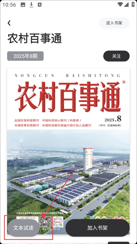2、在《农村百事通》期刊的详情页面,点击【文本试读】按钮,进入文章阅读页面后,即可开始阅读该期刊的内容。