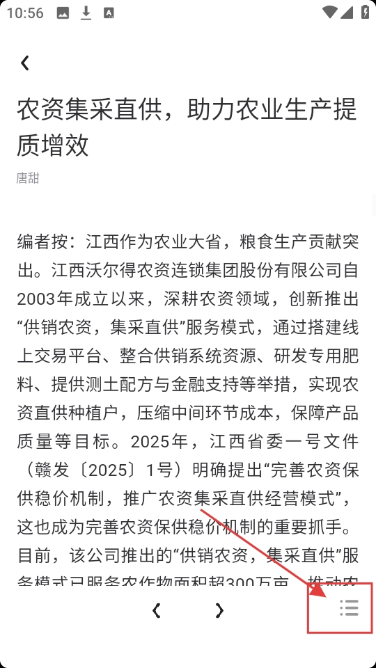 3、在文章阅读页面,阅读《农资集采直供,助力农业生产提质增效》这篇文章,点击页面右下角的目录按钮,查看期刊的目录内容。