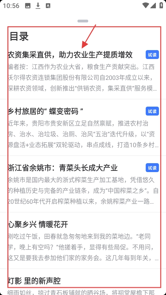 4、在目录页面,可浏览多篇文章的标题,选择感兴趣的文章后,点击【试读】按钮,即可继续阅读该文章的内容。