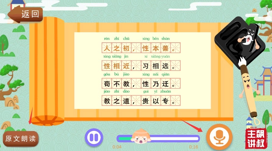 3、进入互动界面,借助跟读或答题的方式来巩固已学的国学知识。