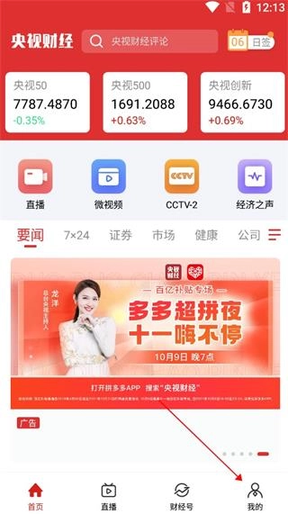 1、在本平台央视财经后,打开软件至首页,点击最下方我的