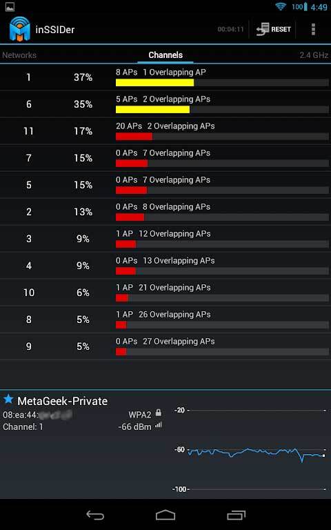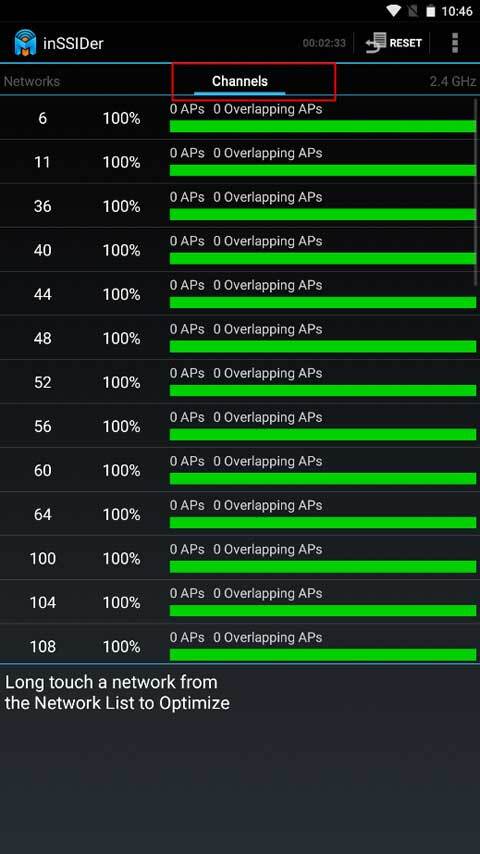 3、要是你想查看整体的信号强度,那就切换到Channels界面。这里绿色代表信号最佳,黄色次之,棕色再次之,红色则是最差的。通过对比能发现,数字越小,信号就越好。