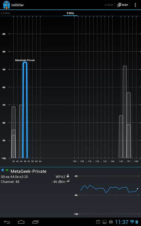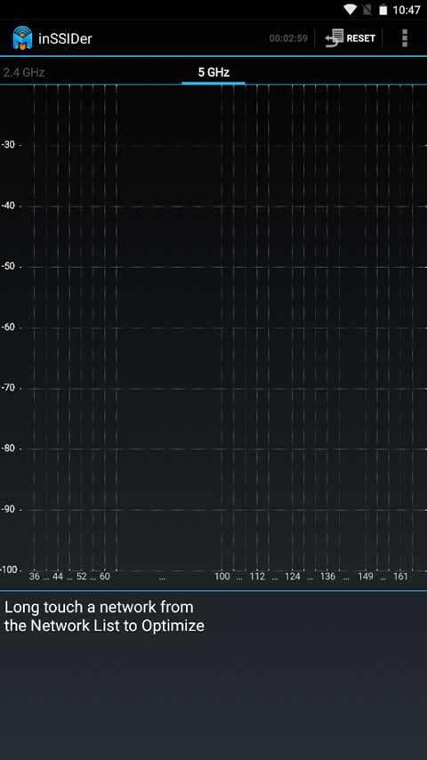 查看5GHz频段的信道使用情况,这是inSSIDer为广大用户提前准备的前沿功能,其显示效果与2.4GHz频段一致。相信在双频段无线网络普及之时,inSSIDer也将为你提供合适的选择。