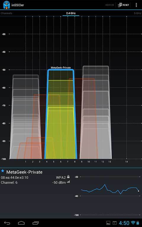 查看2.4GHz频段的信道使用状况,这是inSSIDer颇具特色的一项功能(纵坐标代表信号强度,横坐标对应14个信道)。通过它,我们既能了解各个无线热点占用的信道情况,也能知晓其信号强度。这时,信号强度高且占用信道不拥堵的无线热点便是理想之选。