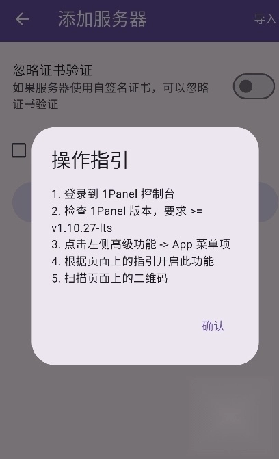 1、打开1panel首先完成登录,点击扫码添加。
