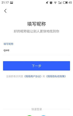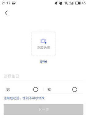 首先在注册环节会提示填写性别信息,且一旦填写完成后就无法再进行修改了。 1、第一步,点击注册按钮,接着填写个人昵称。