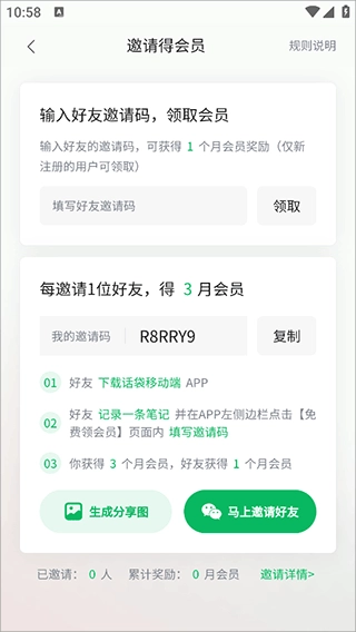 老用户可依次点击「我的」→「邀请得会员」→「马上邀请」,生成专属的邀请码、宣发海报及文案。