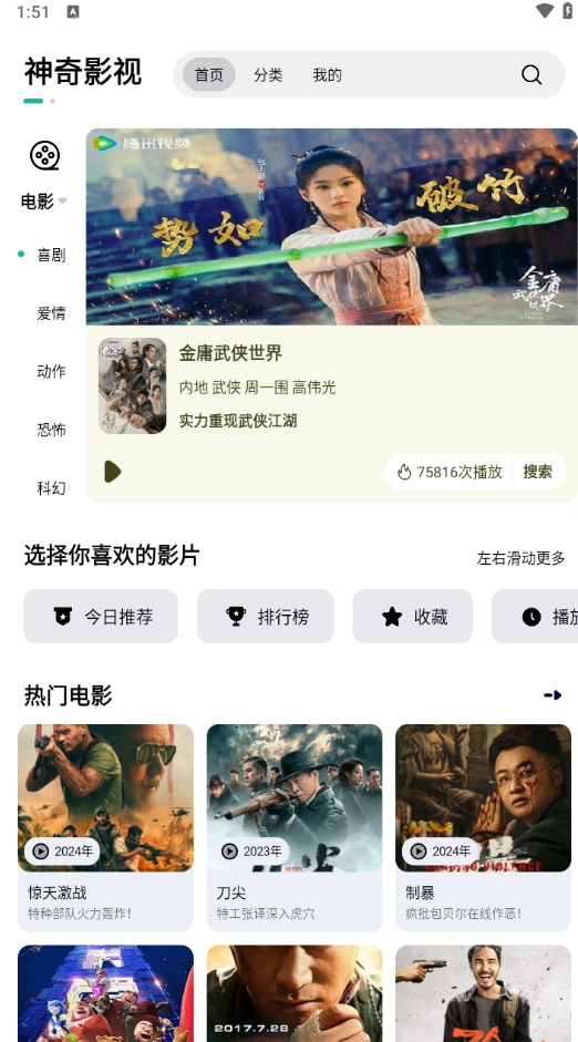 软件首页会呈现近期热门影片,同时具备今日推荐、排行榜等功能。