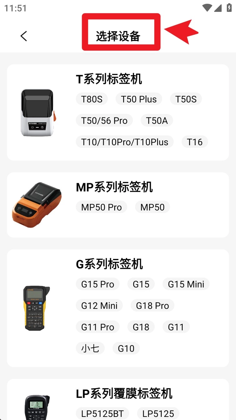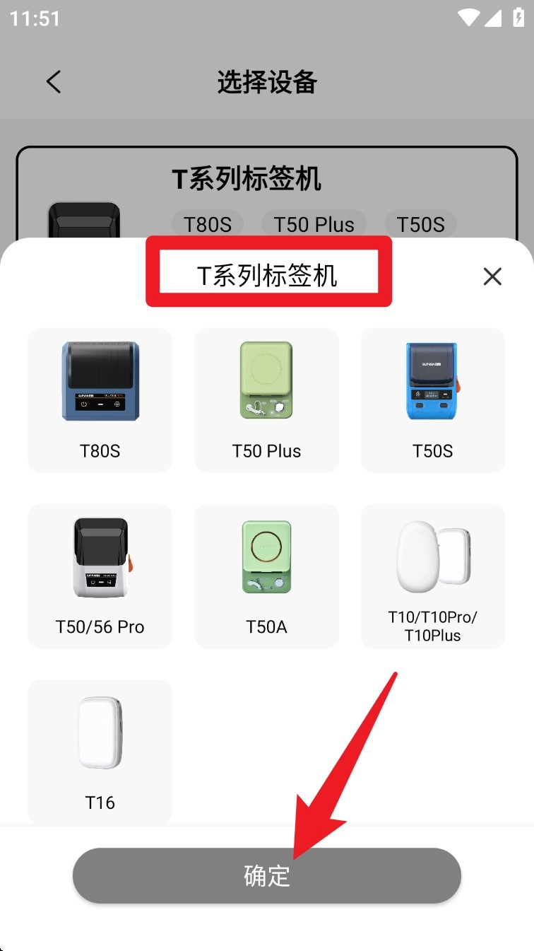 2、请选择您正在使用的打印机型号,例如T50S或T80S,点击对应的型号后,再点击页面底部的“确定”按钮,完成绑定操作后即可进入标签编辑界面。