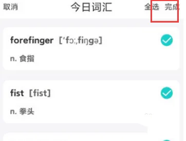 2、点击右上角的图标,勾选需要打印的词汇,再点击【完成】按钮。