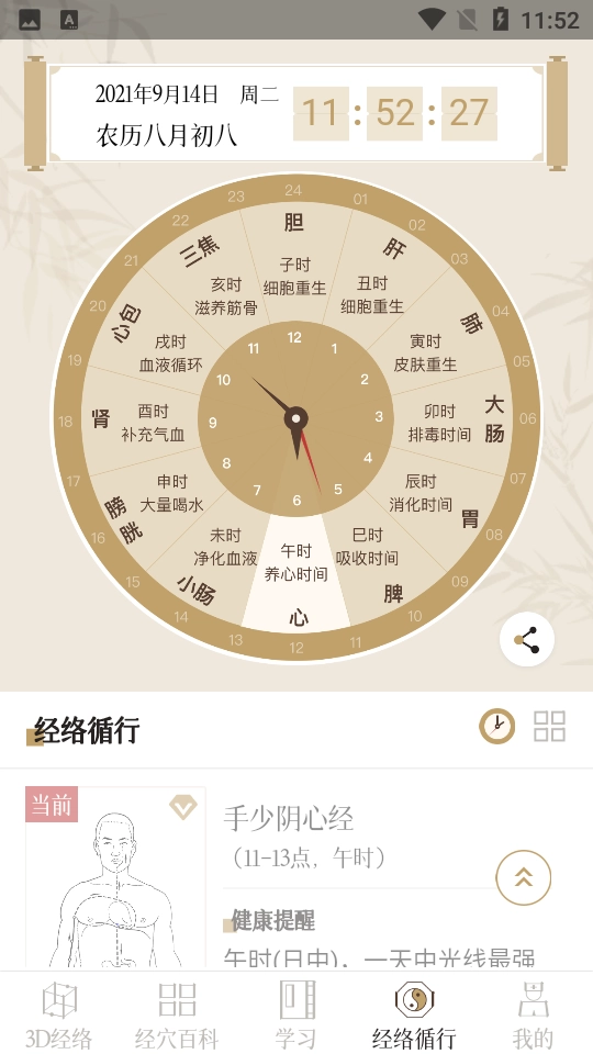 6、【经络时辰】:依据时辰与经脉循行的对应关系,通过360度3D动态图呈现经脉的循行路径,同时结合不同时辰给出针对性的养生指导。
