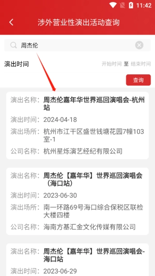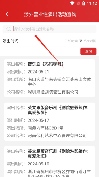 2、进入后,既能够查询某一时间段内的演出名称、场所及时间,也可以通过搜索栏直接搜索特定演出活动的名称。