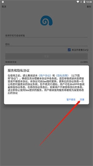 1、打开本站的see微博客户端,点击同意许可条例