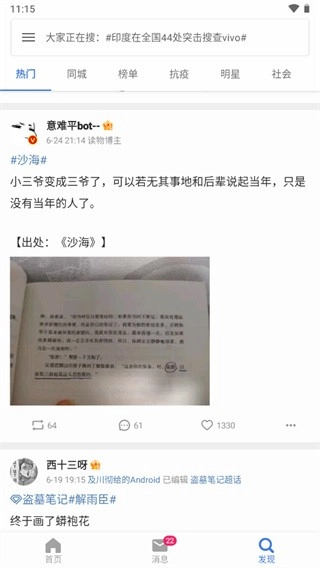 4、在发现界面可以浏览其他相关类别的微博内容,像“热门”、“同城”、“榜单”、“抗疫”、“明星”、“社会”之类都能看到。
