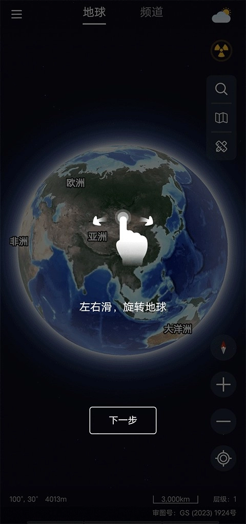 1、这款软件,完成后打开软件,左右滑动选择地球。