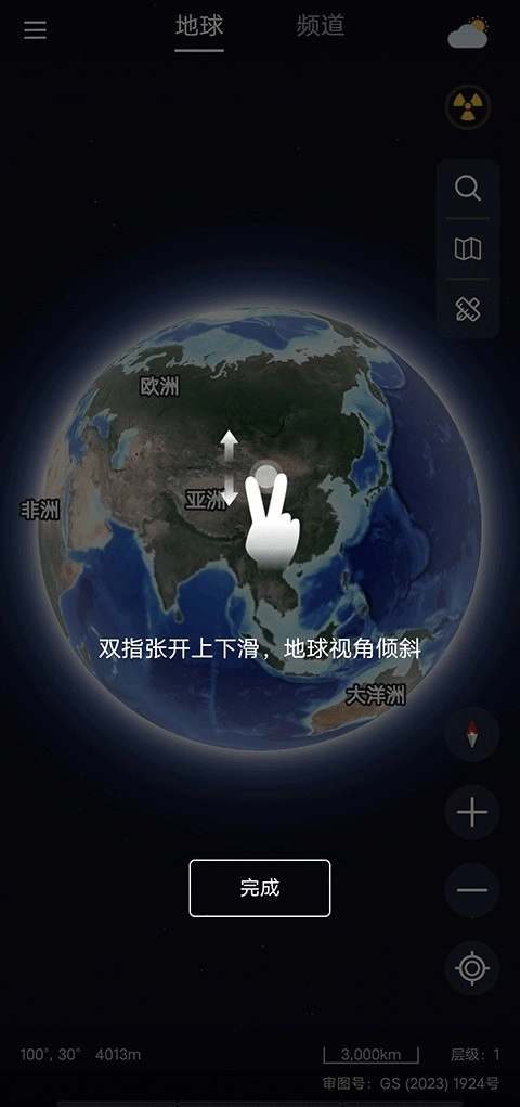 3、双指张开向下滑,地球视角倾斜。