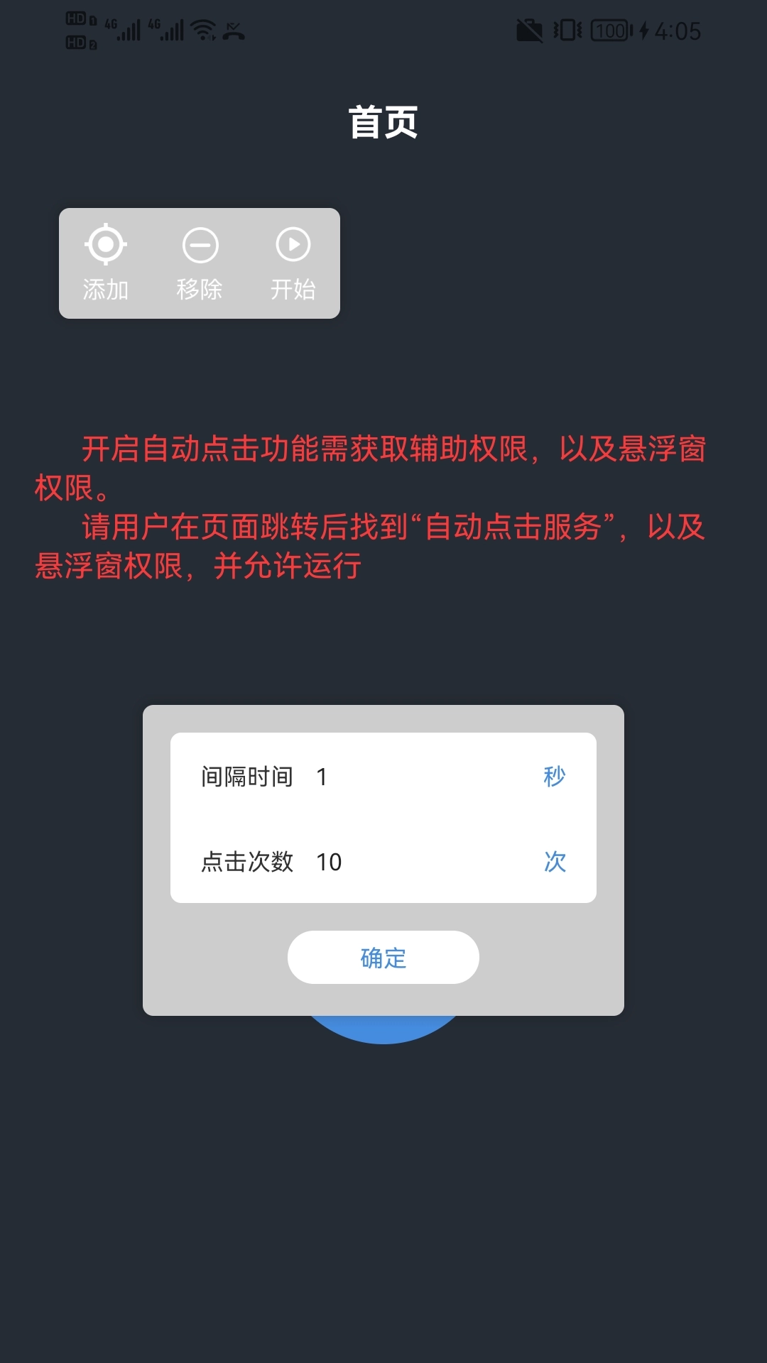 1、开启自动按键点击功能,进入软件后授予其运行所需的必要权限,接着在首页的“任务列表”板块下点击“添加任务”,输入任务名称并点击确定,即可进入下一步操作。