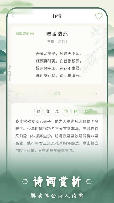 1、每天清晨,App都会推送一首经典诗词,同时附上详尽的解析与背景故事,帮助用户在繁忙的生活里也能领略诗意人生的韵味。