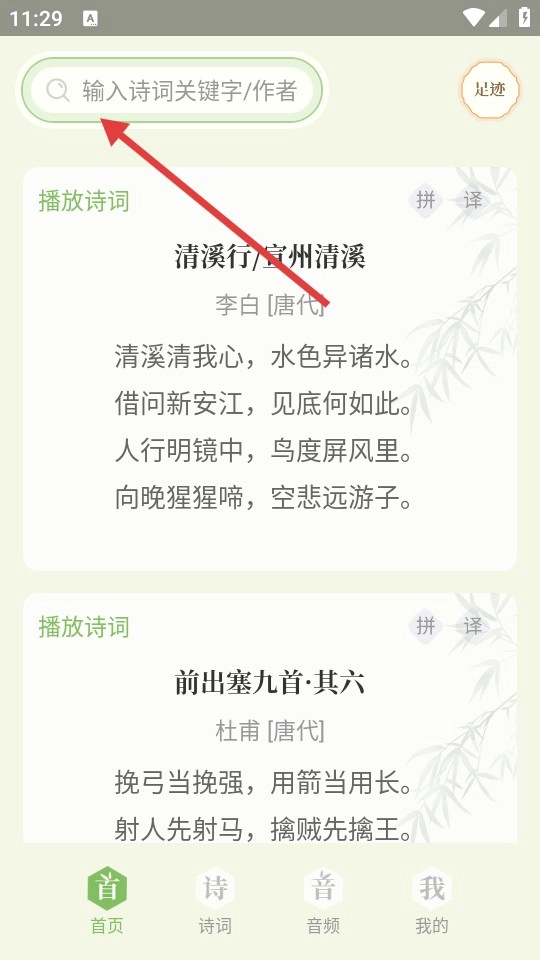 1、进入【首页】后,既可以在搜索框中输入诗词的关键字或者作者姓名来查找对应的诗词,也能够直接播放页面上展示出来的诗词。