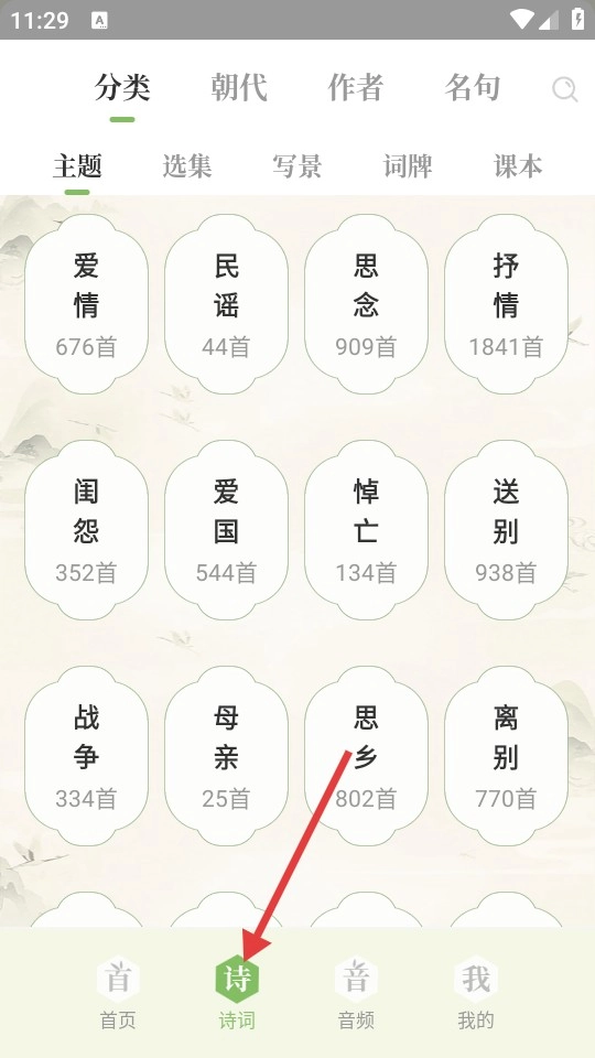 2、点击【诗词】,可以按照分类来浏览诗词,像爱情、民谣、思念这类主题的诗词都能找到。