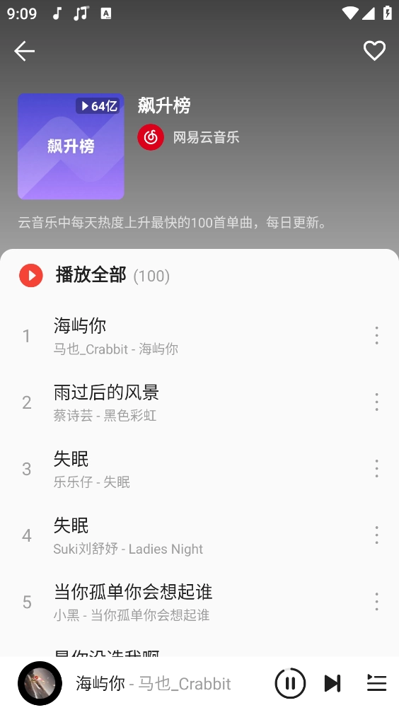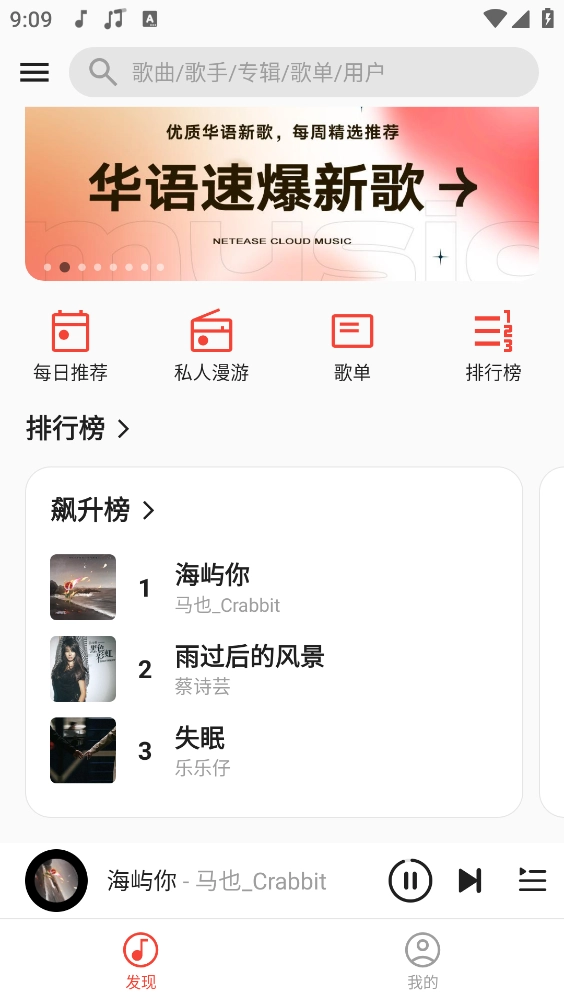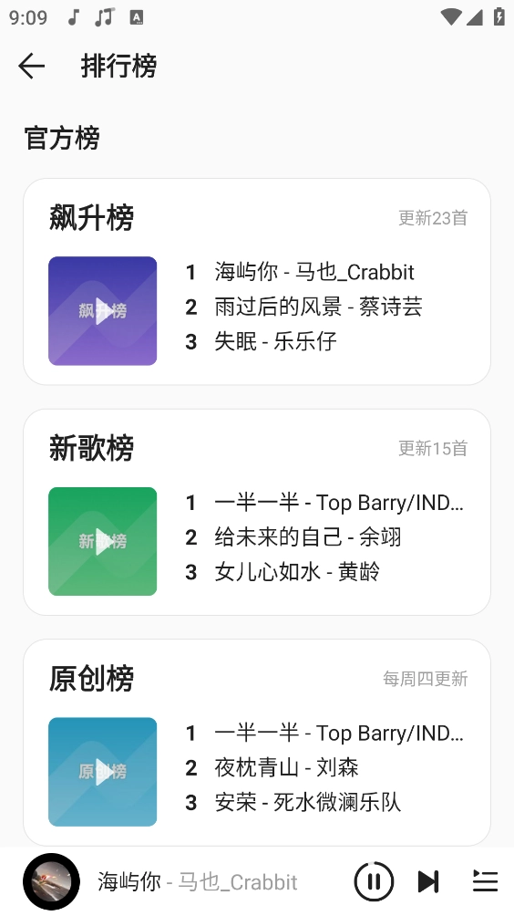 1、热歌榜、新歌榜等多种音乐排行榜支持自由切换,方便你快速开启听歌体验。