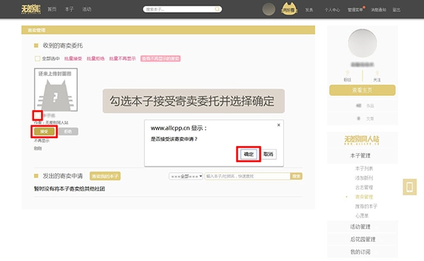 5、接受寄卖的社团可前往【寄卖管理】-【收到的寄卖委托】页面,勾选对应本子后进行确认操作。
